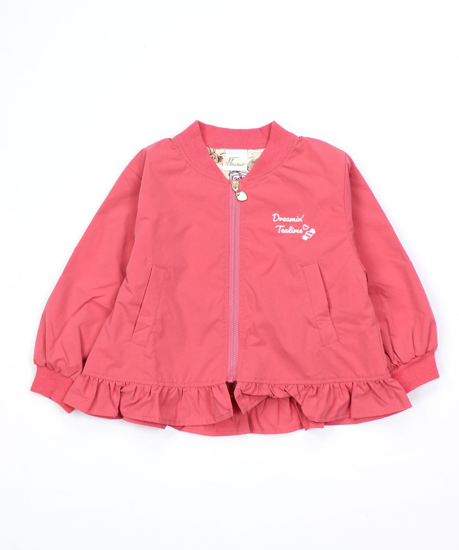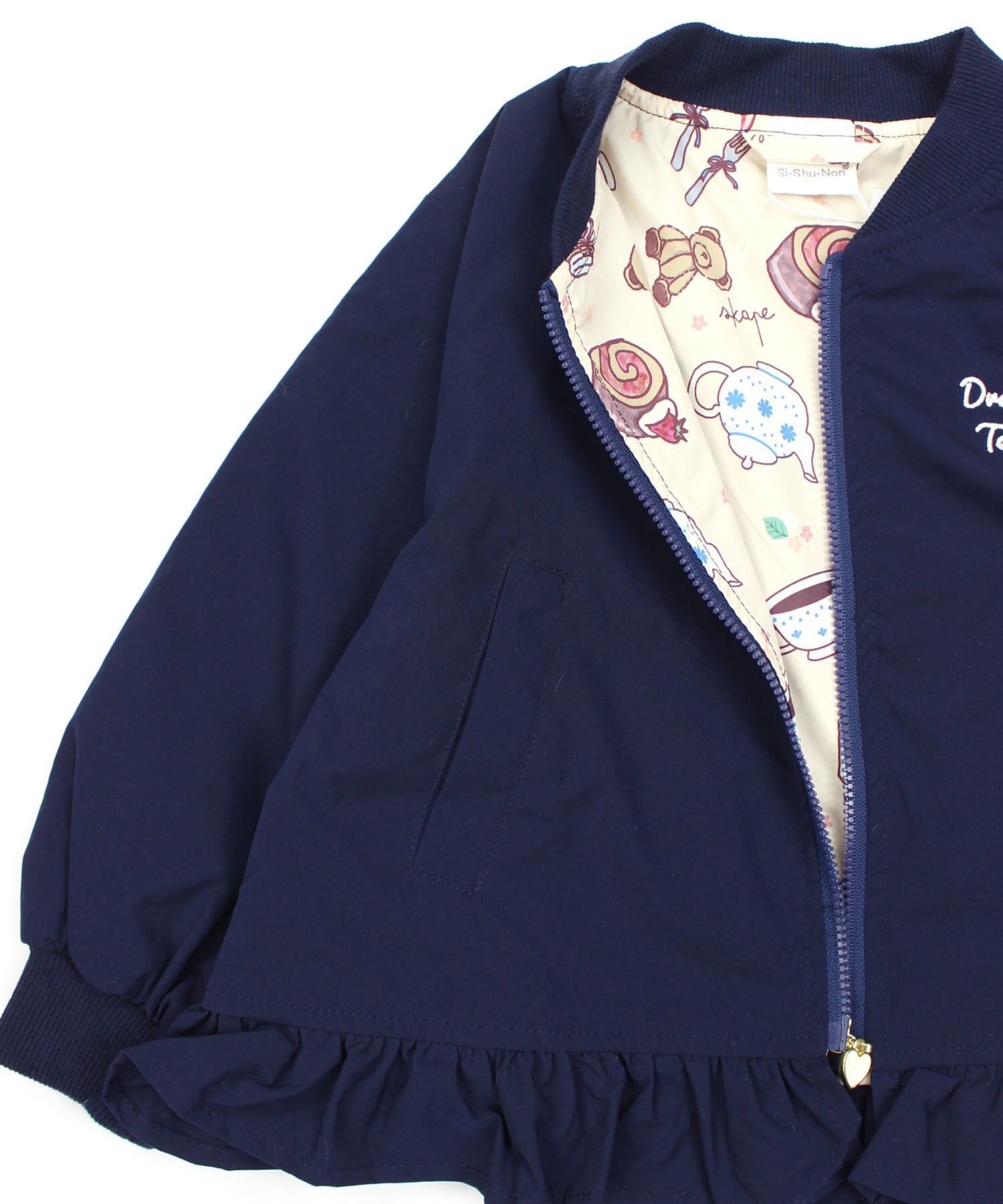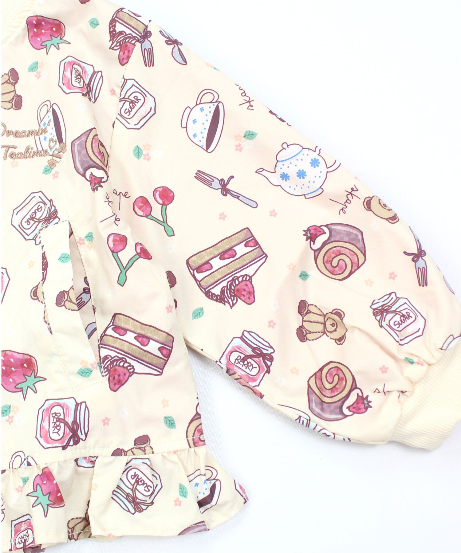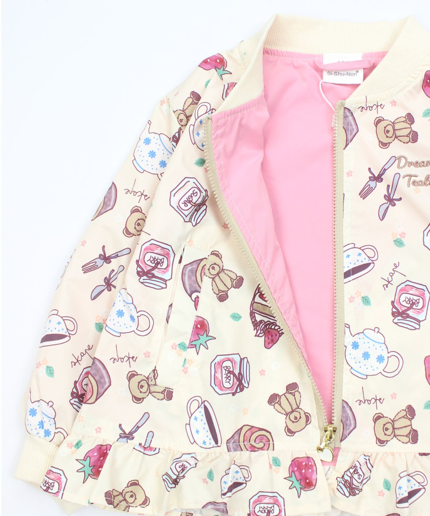 【アイテム説明】裾にフリルをあしらったウインドブレーカー。風を通しづらい素材で使い勝手◎くまさんとケーキの柄はSKAPEだけのオリジナル総柄です。