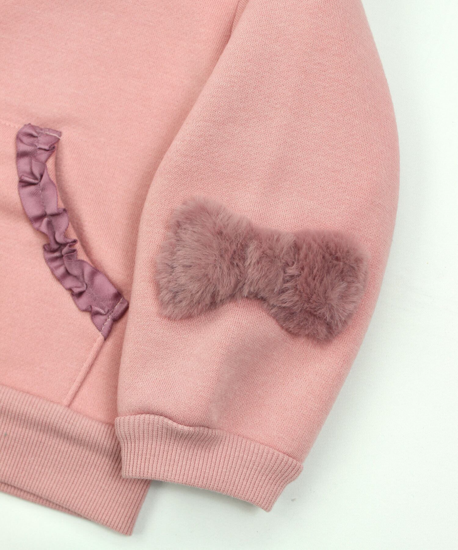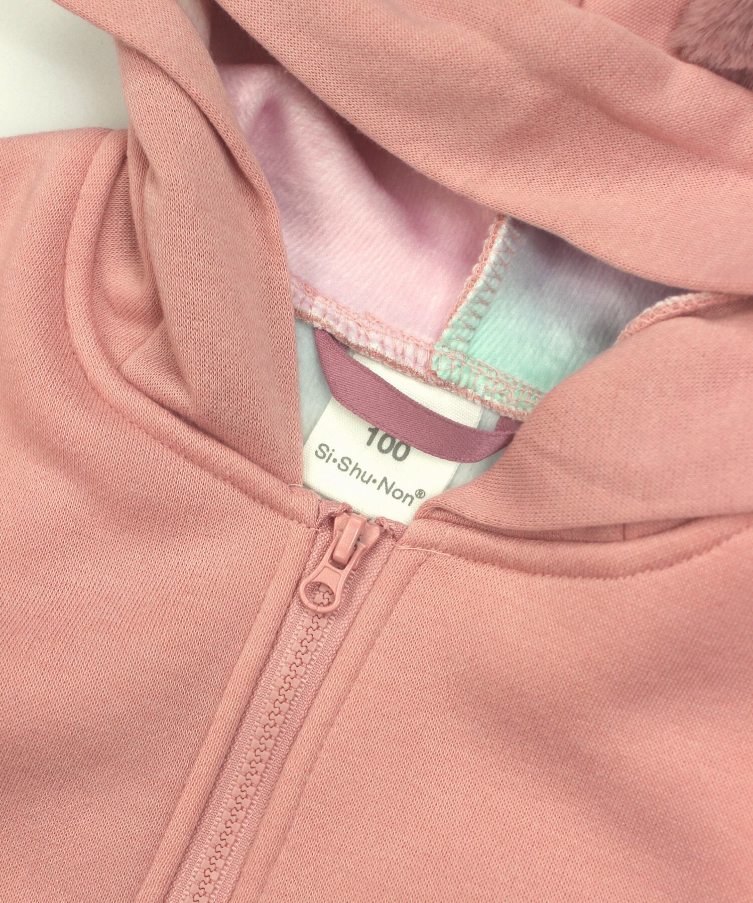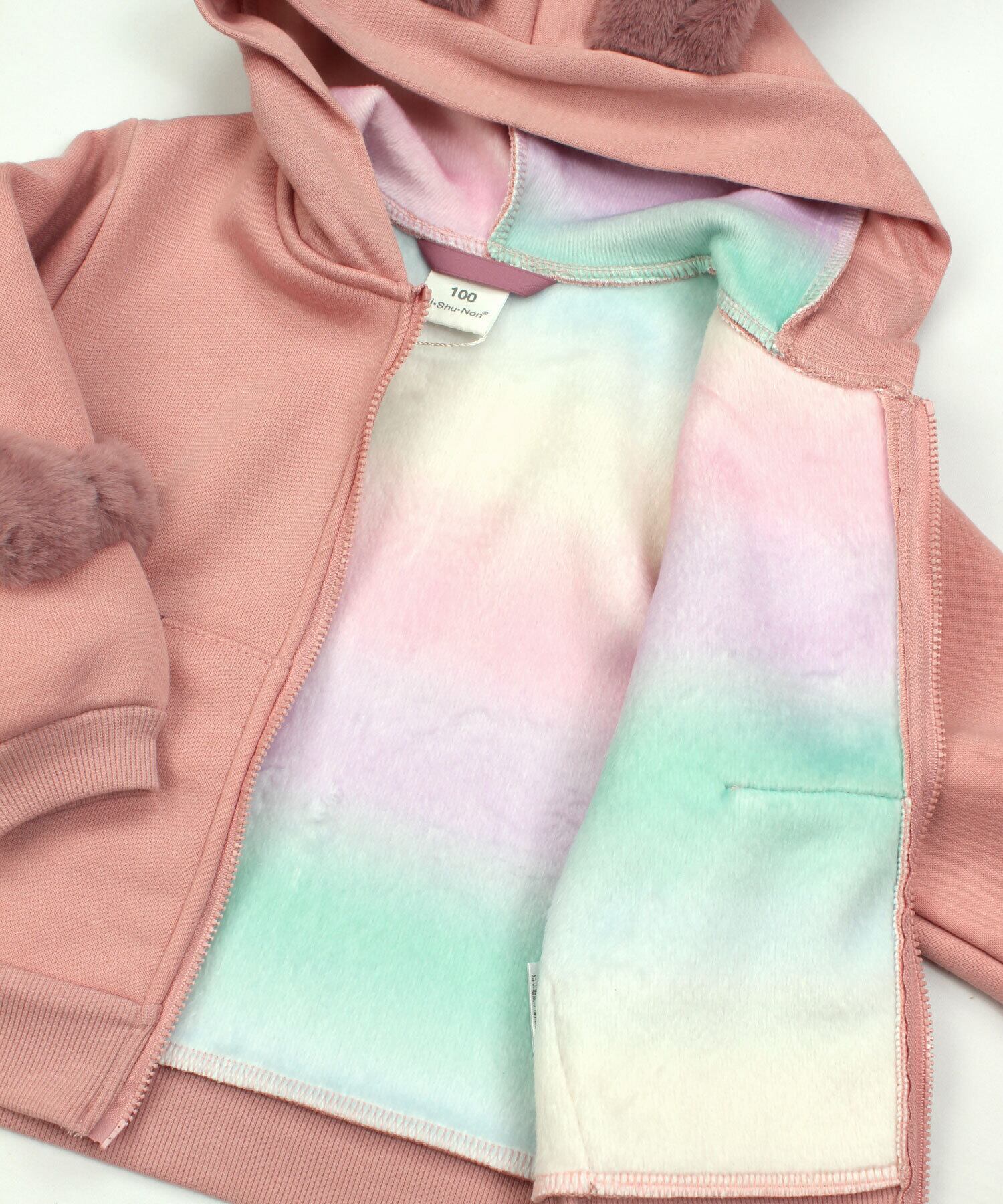 【アイテム説明】耳付きのフードがキュートなパーカーは内側があったかいラビットファー。レインボーの柄も女の子ごころをくすぐります。おでかけにピッタリのデザインです。