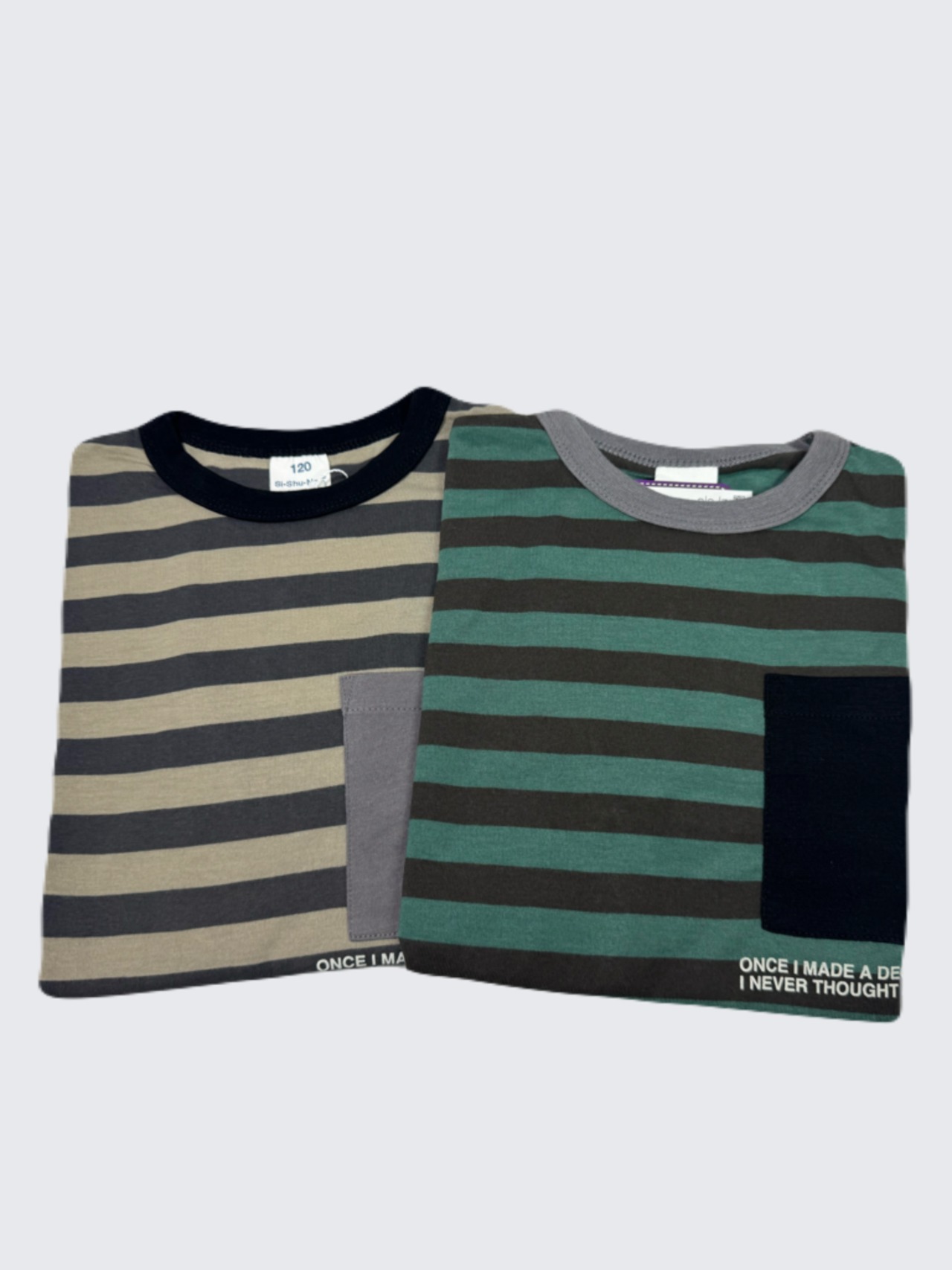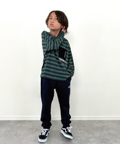 【アイテム説明】シックな配色のボーダーロンTです。後身ネックにはロゴの刺繍がさりげなく入っています。「ありそうであまりない」ジュニアボーイズ服です。