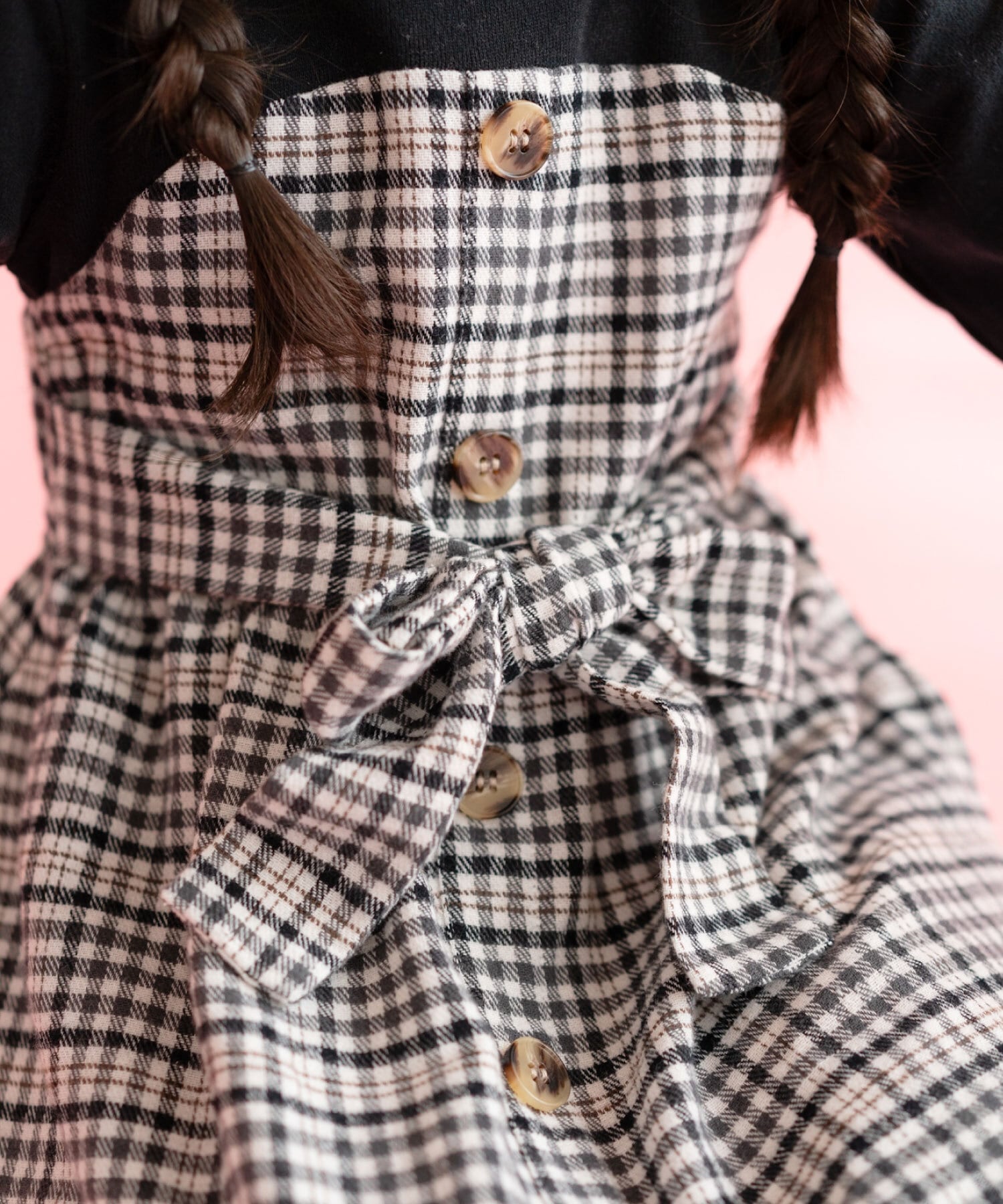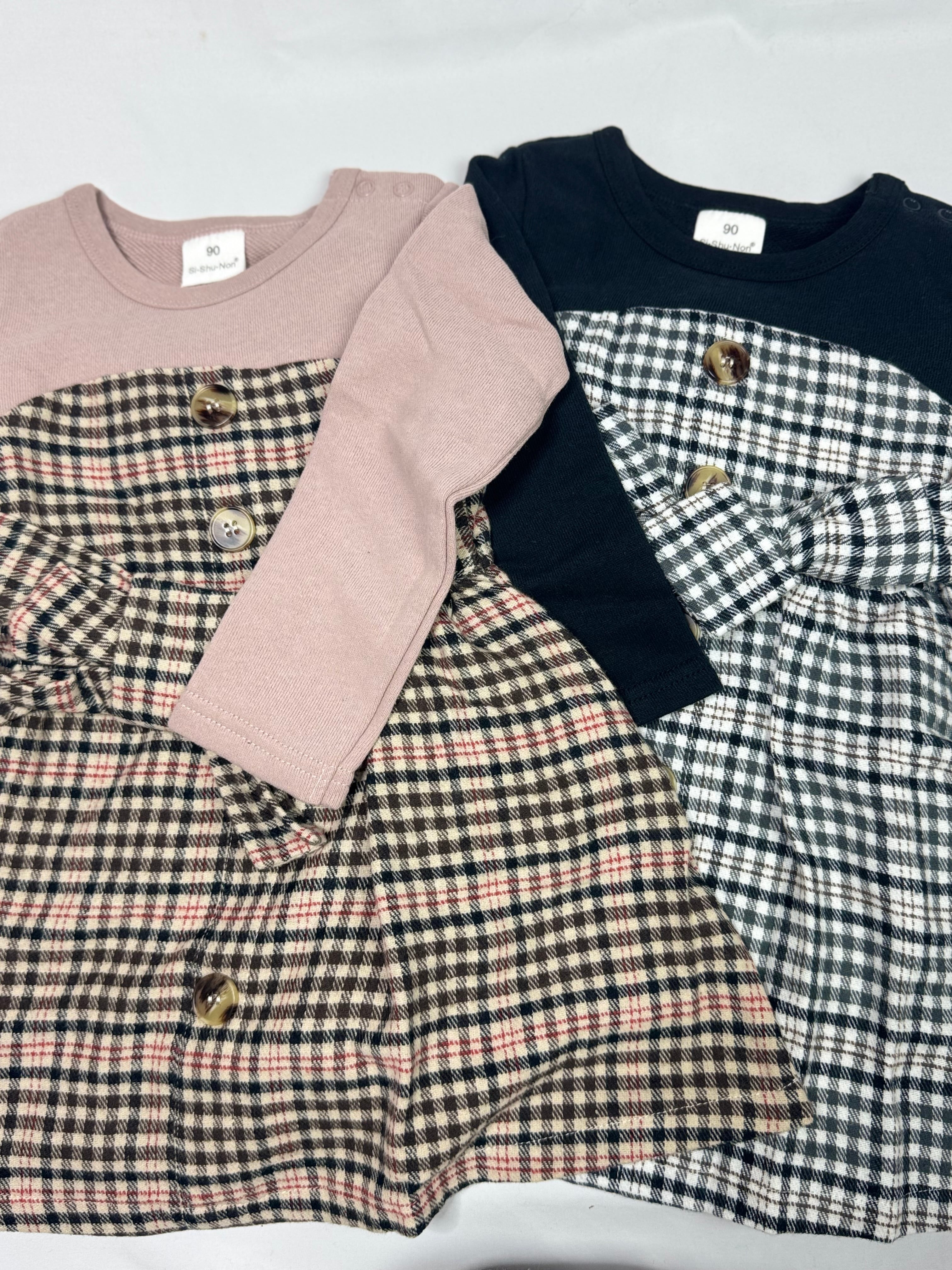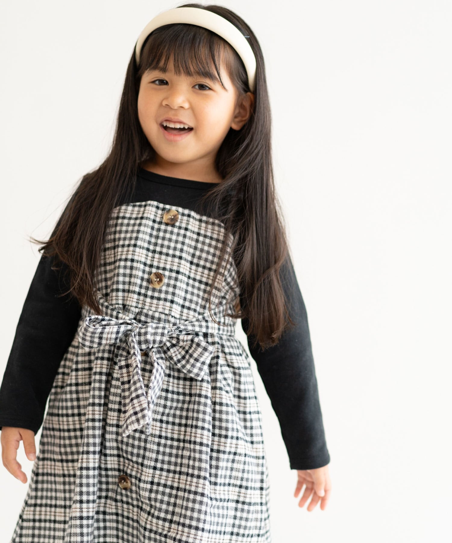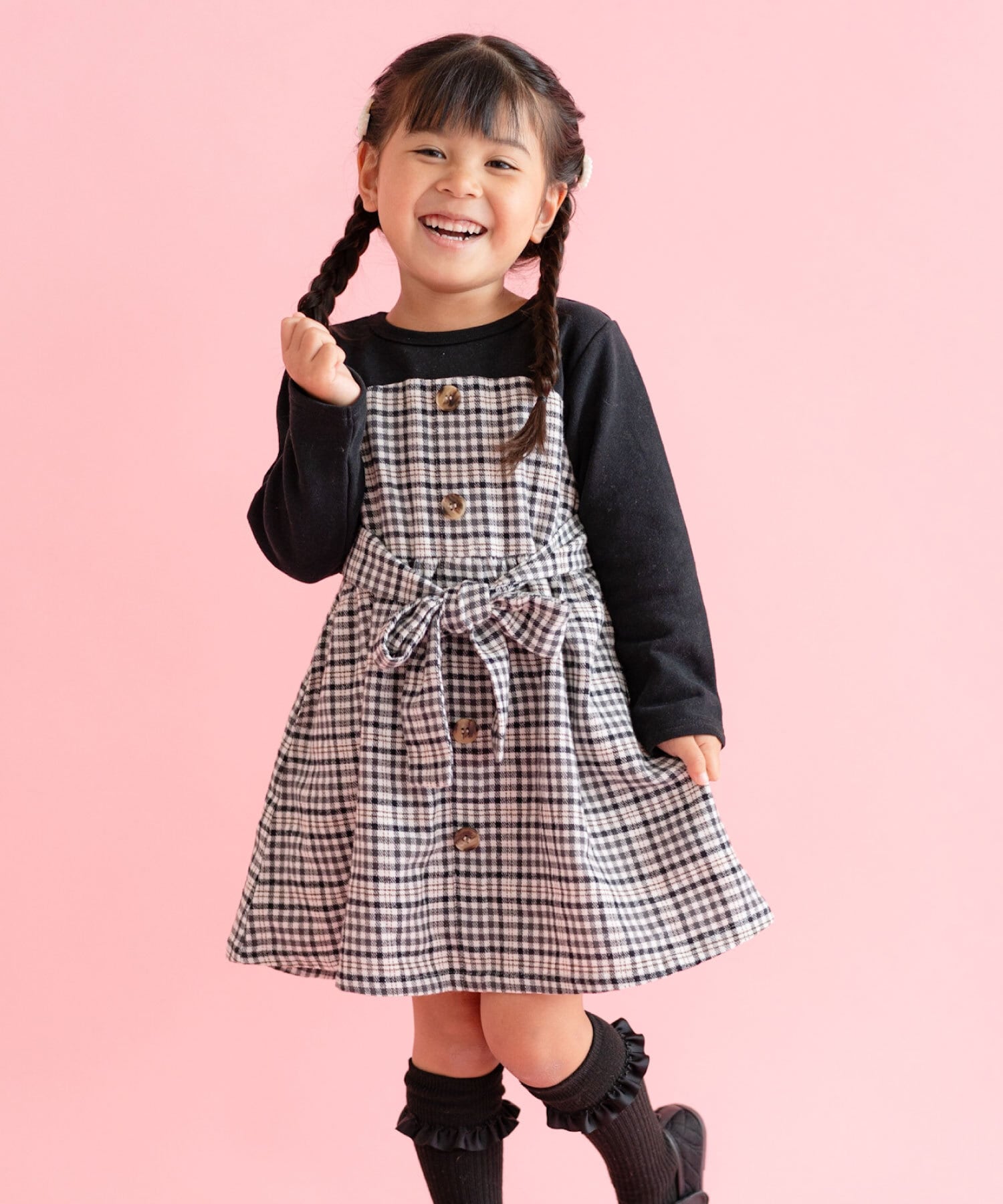 【アイテム説明】チェック生地のレイヤード風ワンピース!両サイドにはポケット付き。ベビーサイズは左肩明き仕様です。