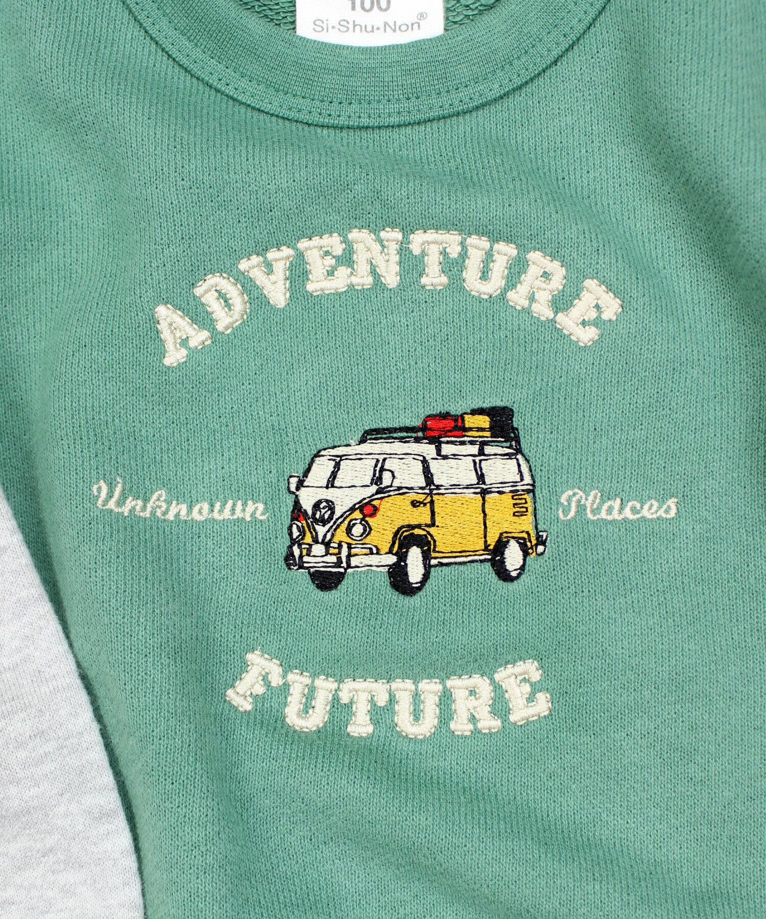 【アイテム説明】ロゴと乗物が刺繍してあるトレーナーです。グリーンはバス柄、グレーはビークル柄です。袖は配色になっています。肌に触れる裏側に10番手の糸を使用した、やわらかい肌心地です。