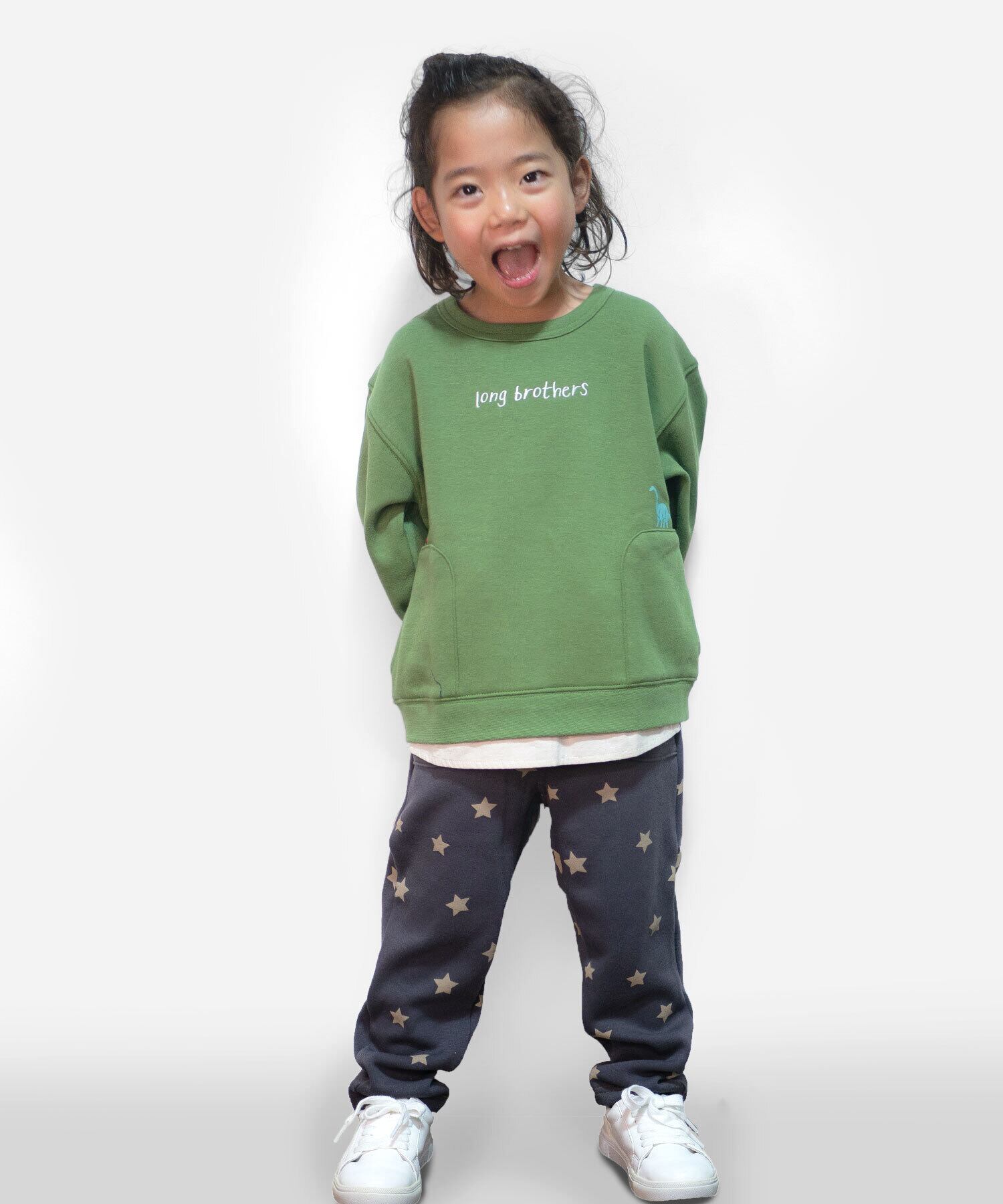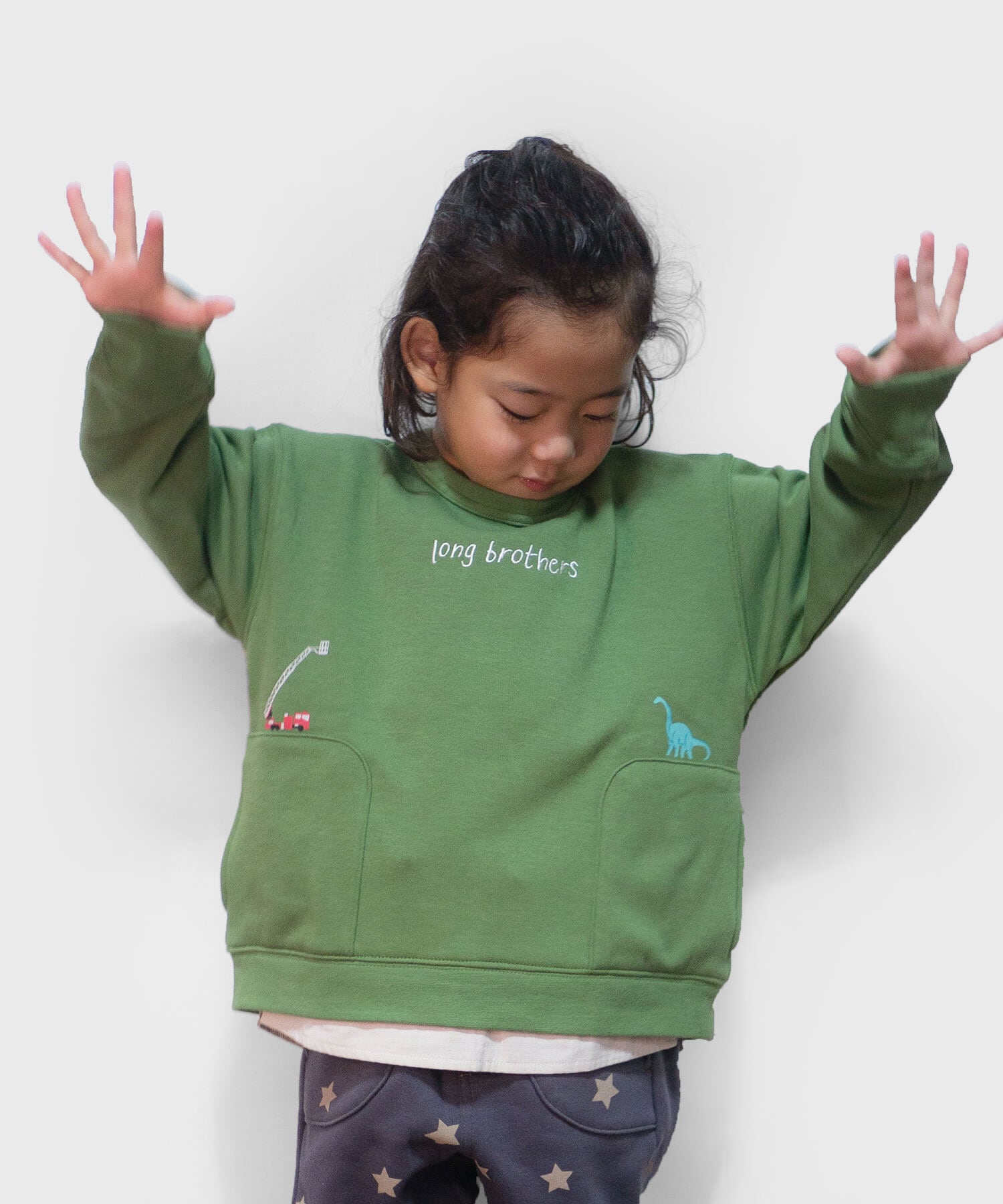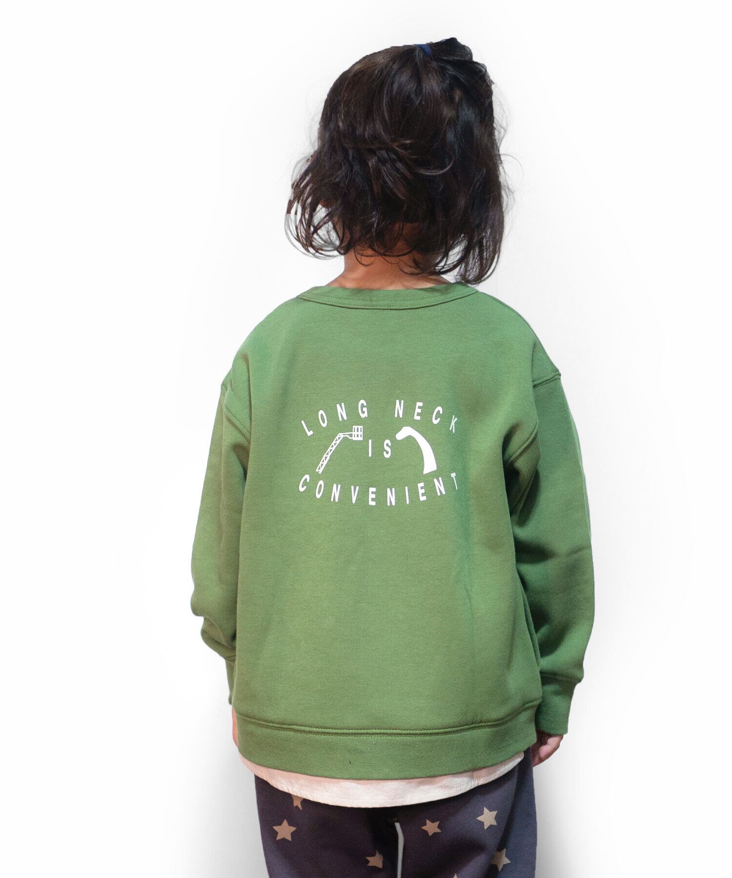 【アイテム説明】消防車とブラキオザウルをプリントしたトレーナーです。裾には重ね着風の切替がしてあります。冬に活躍の裏シャギー素材です。
